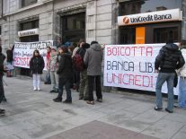 Sono soldi macchiati di sangue quelli che escono da questa banca perché è anche con questi, coi nostri risparmi, che vengono pagati i mercenari che stanno uccidendo decine di migliaia di persone.
